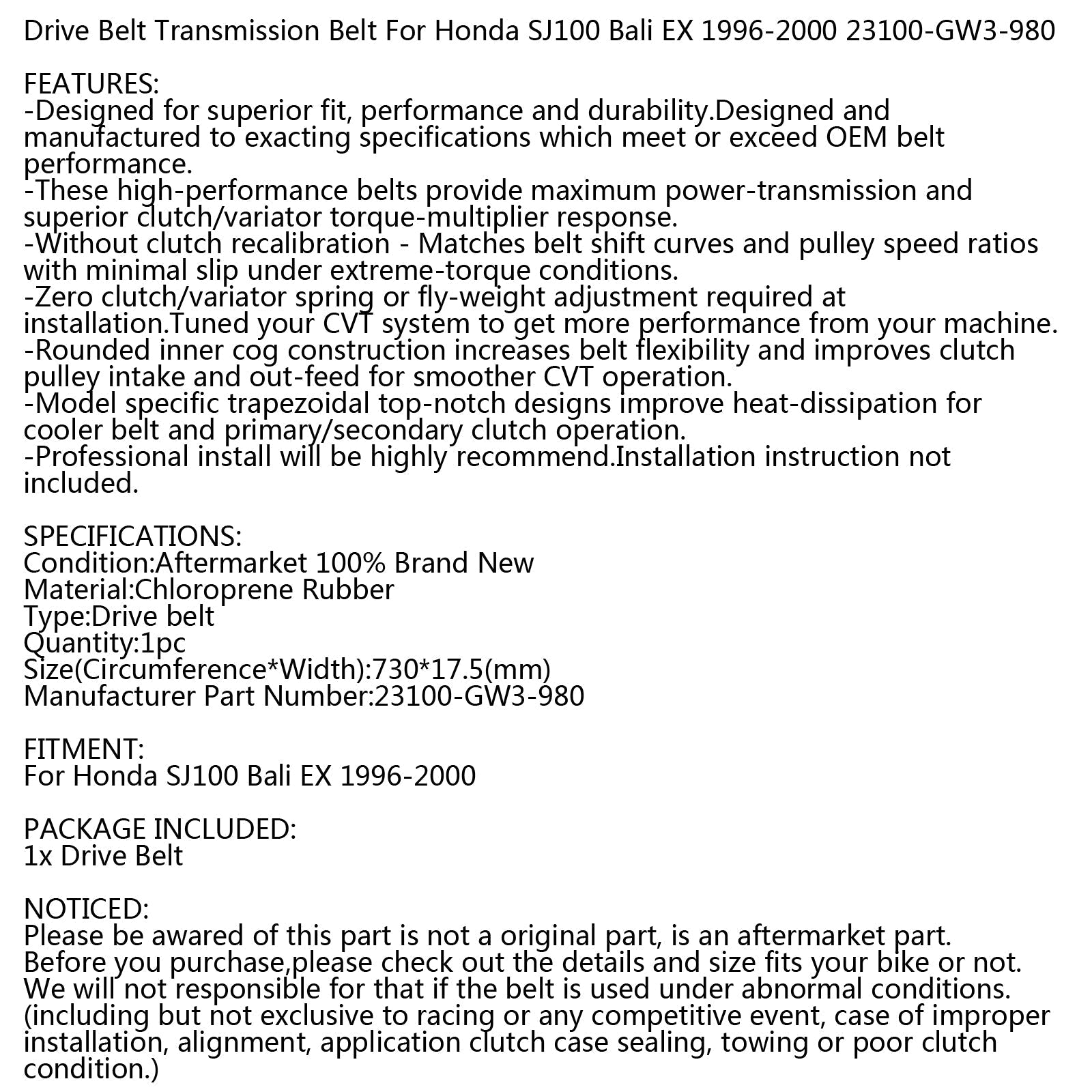 Drive Belt For Honda Scooter SJ 100 Bali EX 96 97 98 99 00 23100-GW3-980 Generic