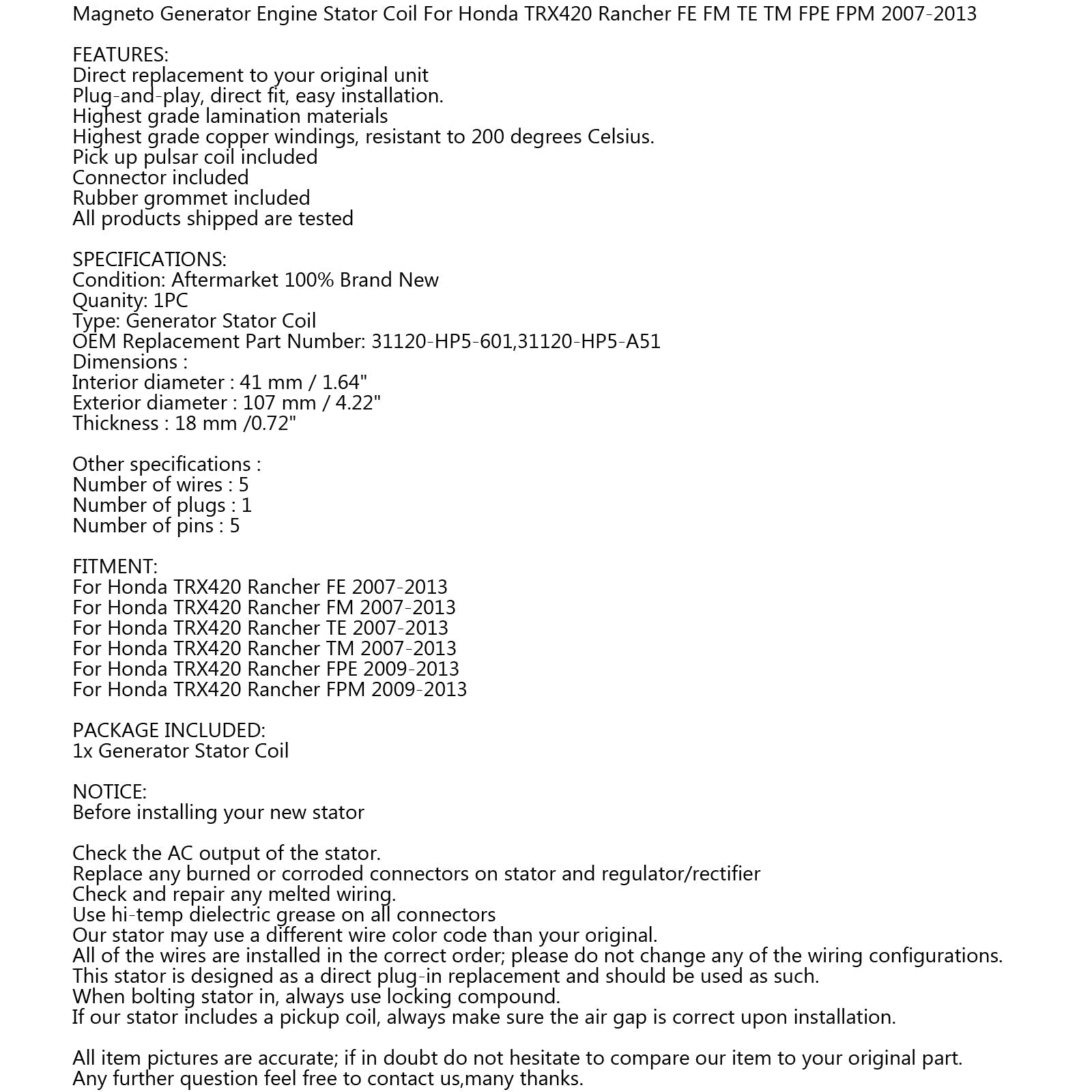 Generator Stator Coil For Honda TRX420 Rancher FE FM 2007 2008 2009 2010-2013 Generic