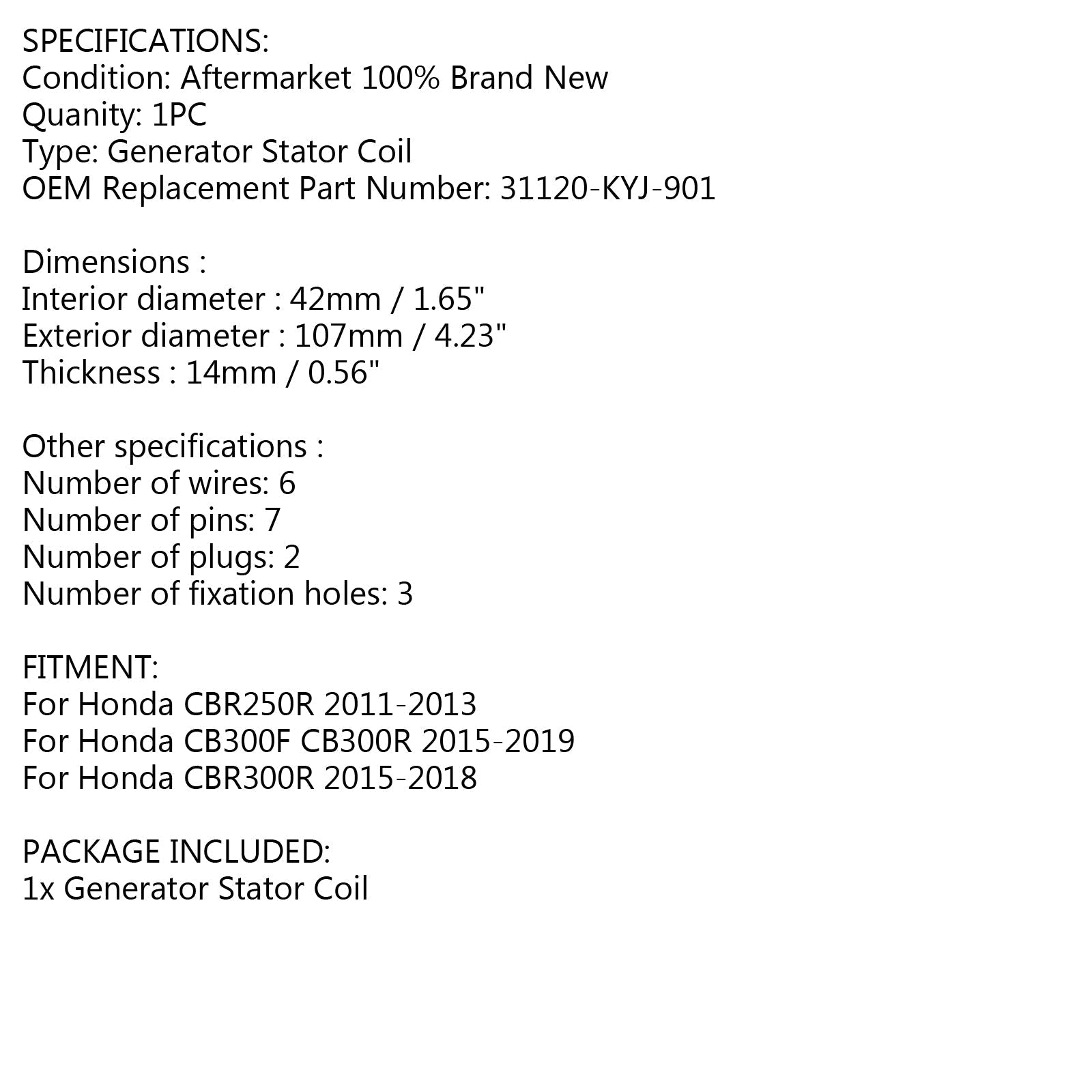 Generator Stator For Honda CBR R CB F 250 300 2011 2012 2013-2019 31120-KYJ-901 Generic