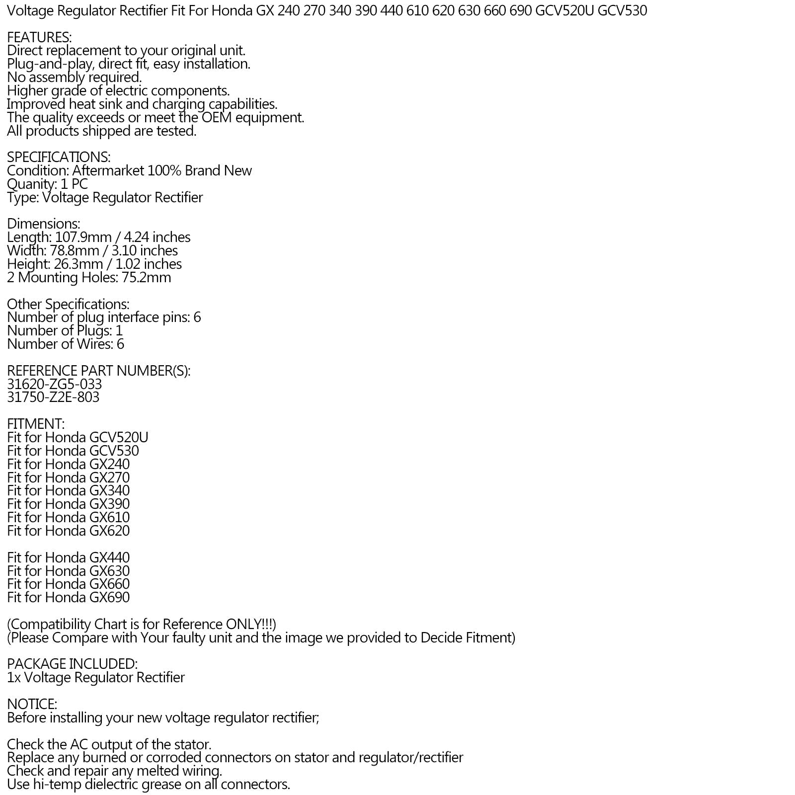 Voltage Regulator Rectifier Fit for Honda GX440 GX630 GX660 GX690 31750-Z2E-803 Generic